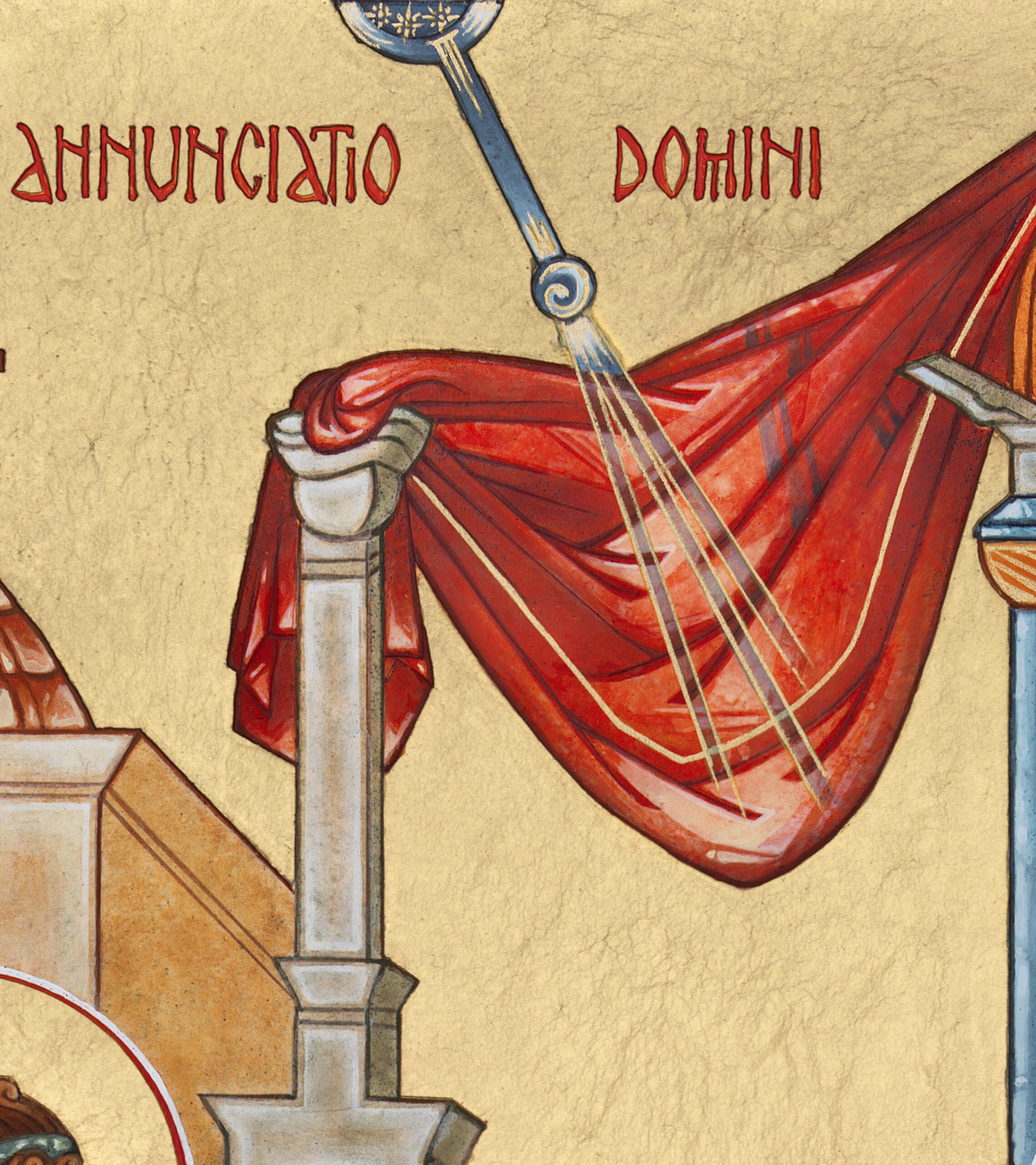 Op de icoon van de Aankondiging van de Heer hangt een rode doek. Gedrapeerd tussen de twee gebouwen, hoog in het midden van de afbeelding. Het oog van de een valt er meteen op. Een ander gaat er aan voorbij.