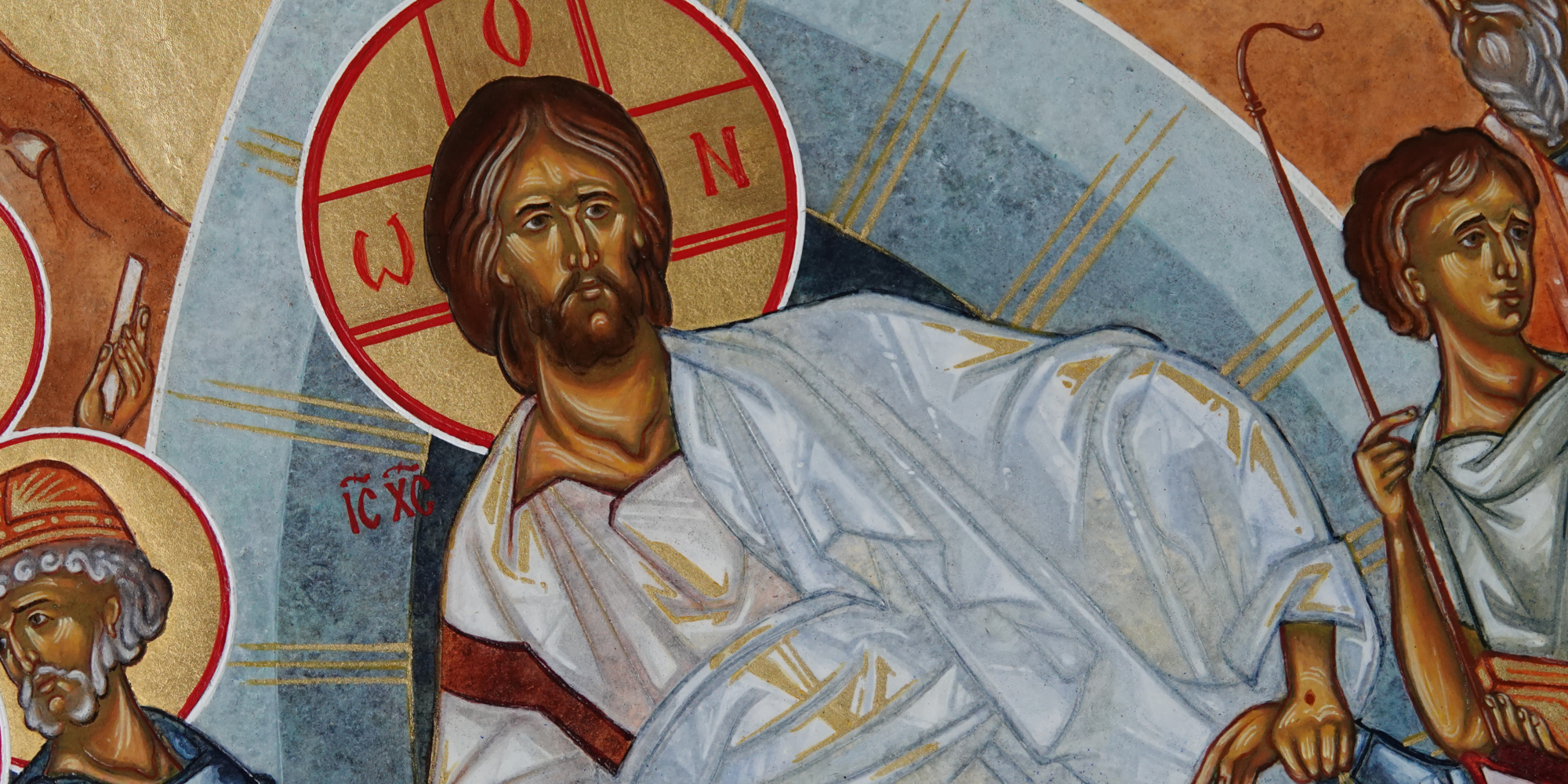Die Naam uit het Oude Testament keert terug in bijna elke Christus-icoon, korter, ingekort, maar onmiskenbaar. In het aureool staan drie letters: Ο ω Ν. Ze verwijzen naar het Grieks ὁ ὤν (ho ōn): “Hij die is.” Daarmee wordt zichtbaar dat dit beeld van Christus méér is dan wat je ogen kunnen zien. Hier wordt Hij aangewezen als de Aanwezige.